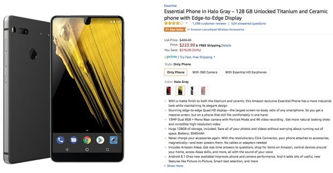 پس از آنکه گوگل به طور رسمی از اندروید 9 Pie رونمایی کرد، قیمت اسنشال فون به 330 دلار رسید، اما همانطور که پیش تر عنوان شد ارزش این گوشی حتی از 300 دلار هم کمتر شد و در روز Prime Day پایین تر از 280 دلار شد. قیمت این گوشی حالا حتی از 250 دلار هم ارزان تر است. به طور دقیق شما می توانید نسخه آنلاک شده تیتانیوم- سرامیکی این گوشی را با قیمت 223.99 دلار تهیه کنیدو این گوشی دارای 128 گیگابایت حافظه ذخیره سازی، 4 گیگابایت حافظه رم، صفحه نمایش 5.7 اینچی IPS LCD با رزولوشن 2560×1312 پیکسل، چیپ ست اسنپدراگون 835 کوالکام و دوربین بهبود یافته دوگانه 13 مگاپیکسلی می باشد.