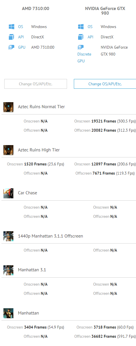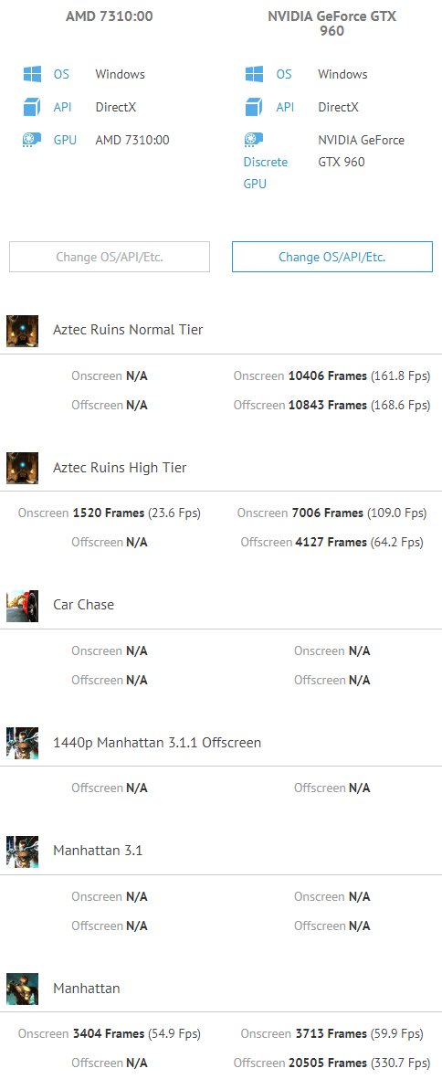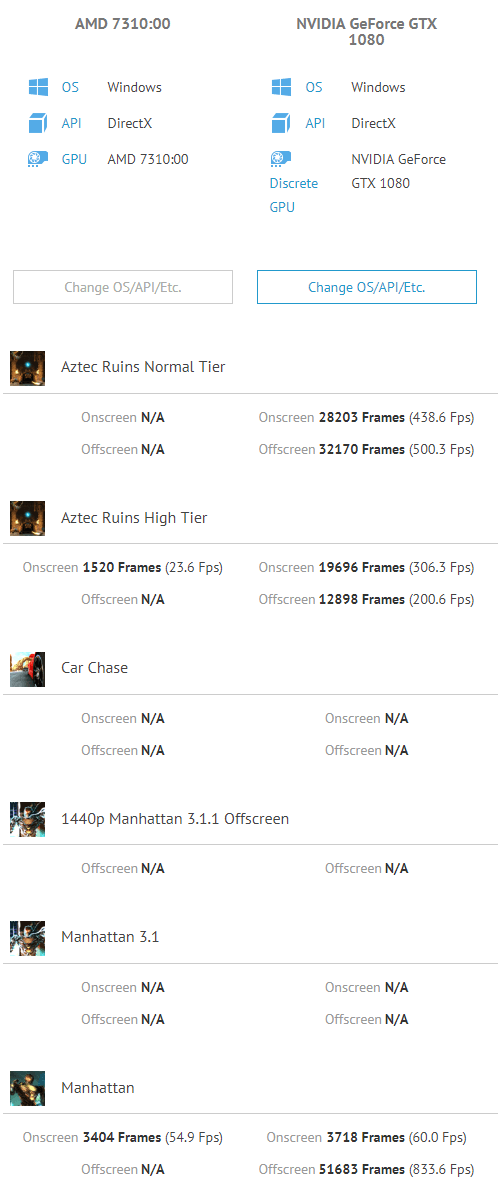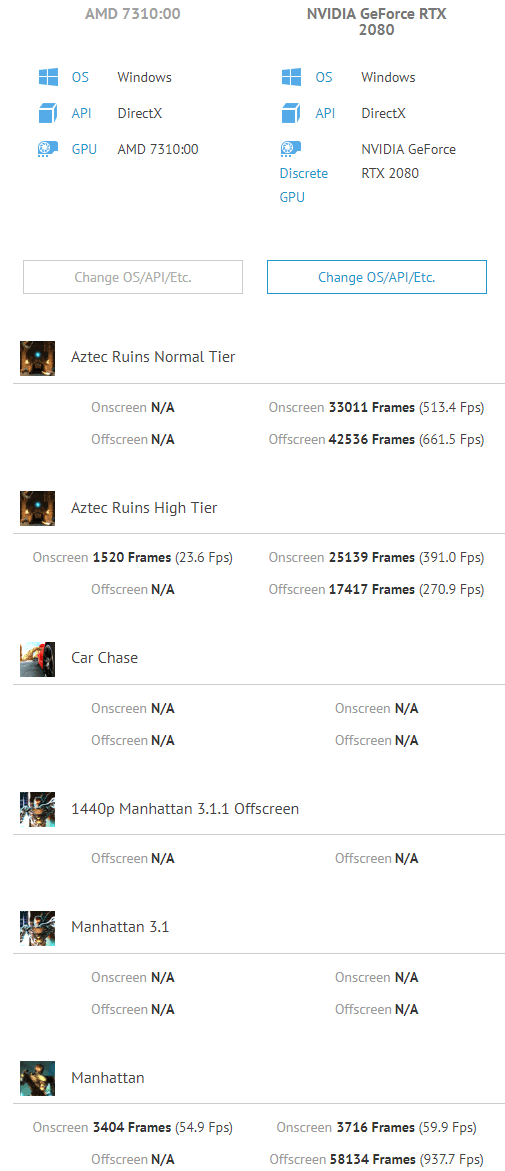 حالا اگر این امتیازات را با رقبا مقایسه کنیم به نکات دیگری برمی‌خوریم، تقریبا اکثر کارت گرافیک‌های میان رده و بالا رده در بنچمارک Manhattan به محدوده 60 فریم می‌رسند، حتی کارت گرافیک قدیمی GTX 960 اما نمونه Navi در اینجا نتوانسته این کار را انجام دهد. این کارت در بنچمارک Aztec Ruins نیز عملکرد بسیار پایینی از خود نشان داده که باز هم تایید می‌کند با یک نمونه اولیه طرف هستیم و احتمالا درایور مورد استفاده نیز بهینه نبوده است. در پایین مقایسه کارایی چند کارت گرافیک در برابر این کارت برپایه Navi را مشاهده خواهید کرد:
