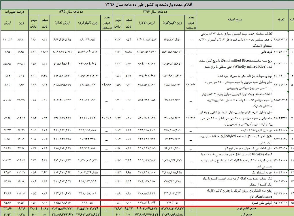 هفته گذشته گمرک جمهوری اسلامی ایران بخشی از گزارش های مربوط به وضعیت سال 96 را تا پایان دی ماه اعلام کرد. در جداول منتشر شده که مربوط به اقلام عمده وارد شده به کشور طی ده ماه اول سال 1396 و مقایسه آنها با وضعیت همین کالاها در بازه زمانی مشابه سال گذشته هستند، تلفن های هوشمند در ردیف پانزدهم محصولات وارد شده به کشور قرار دارند.