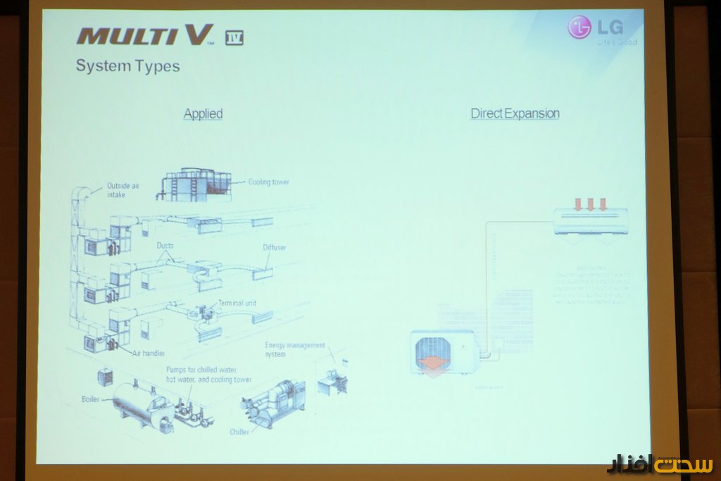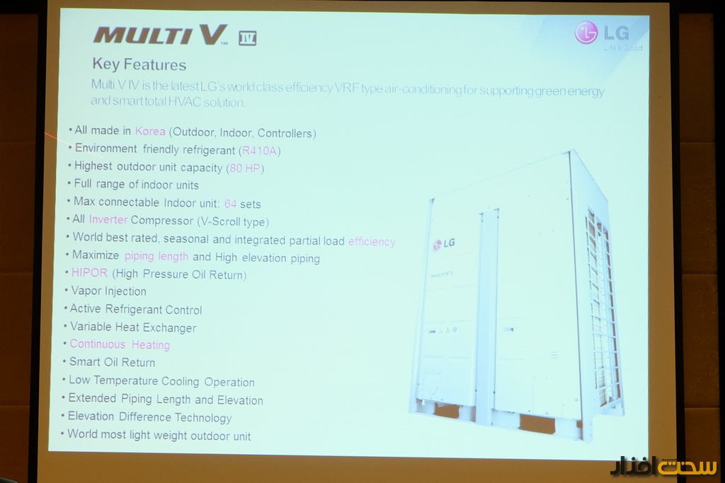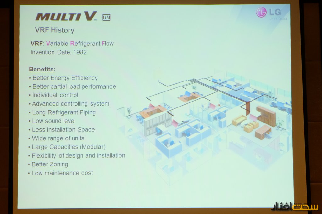 در گذشته نه چندان دور مناسب ترین سیستم سرمایش مرکزی، انواع چیلر ها بودند. ولی امروزه با فناوری VRF هر روزه مهندسان بیشتری این نوع دستگاه ها را به عنوان بهترین سیستم تهویه انتخاب می نمایند. قابلیت ارایه گرمایش و سرمایش توسط یک سیستم کاملا یک پارچه، با سیستم کنترل واحد، عدم نیاز به موتور خانه و تکنسین نگهدار و همچنین مصرف برق اندک و ضریب عملکرد (COP) بالای دستگاه های VRF به خصوص در فشار کاری جزیی فقط تعدادی از مزیت های شاخص این نوع سیستم ها محسوب می شود. دستگاه های تهویه مولتی وی ال‌جی نیز از فناوری VRF بهره می گیرند. این نوع دستگاه ها شامل یک واحد بیرونی و چندین واحد درونی است و در ظرفیت 80 هزار تا 800 هزار BTU موجود هستند. واحد بیرونی شامل کنداسور، کمپرسور، مغز هوشمند دستگاه و موارد دیگر بوده و یک جفت لوله رفت و برگشت گاز مبرد به آن متصل است. ولی از آن یک جفت لوله می توان انشعابات متعددی گرفت و ده ها واحد درونی (حداکثر 64 واحد) که نقش اواپراتور را ایفا می کنند به همان یک کندانسور متصل نمود. امکان لوله کشی در فواصل زیاد، امکان نصب در پروژه های مرتفع، امکان نصب انواع واحد های درونی، کنترلر مرکزی و بهره گیری از مبرد R 410 a که دوستدار محیط زیست است و همچنین عدم نیاز به مصرف آب، برخی از دلایل استقبال گسترده و روز افزون مهندسان مشاور برای استفاده از این سیستم است.