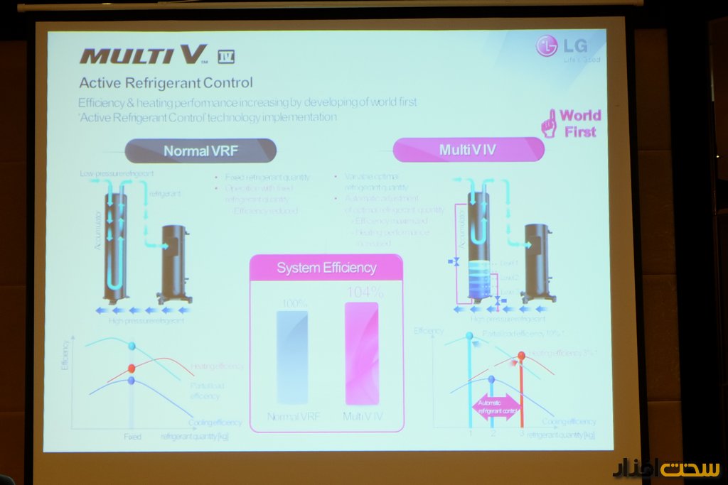 3. کنترل هوشمند مقدار مبرد: محققان ال‌جی دریافتند که تناسب میزان مبرد در گردش در سیکل با شرایط دمایی تاثیر شگرفی بر میزان مصرف انرژی دستگاه دارد. بدین منظور دستگاه مولتی وی 4 قادر است تا به کمک مخزن مبرد خود و به صورت هوشمند میزان مبرد در جریان در سیکل را بر اساس کار کرد سرمایش، گرمایش یا بار نسبی کاهش یا افزایش دهد.