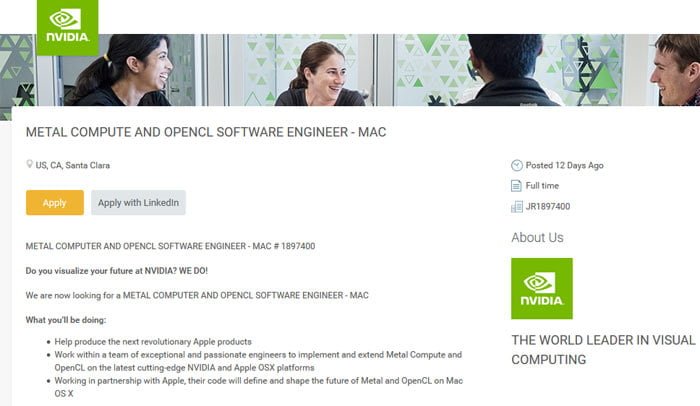 اپل تولید کننده کامپیوترهای شخصی iMAC است و این محصولات به دلایل متعدد مانند نرم افزارهای اختصاصی در زمینه های طراحی،پنل های سفارشی با دقت بالا،ظاهر زیبا و تجهیزات جانبی حرفه ای بسیار مد نظر کاربران در سراسر جهان از جمله ایران هستند.مک بوک های جدید اپل از جدید کارت گرافیک های AMD استفاده خواهند کرد و این قاعده در آی مک ها نیز پیروی می شود.در نتیجه برای یک سال اخیر انویدیا از این بازار به دور بوده است.انویدیا به تازگی اطلاعیه ای را منتشر کرده است که نشان از همکاری مجدد با اپل دارد.انویدیا در حال تجمیع یک تیم تخصصی است و برای این هدف چند آگهی استخدام را منتشر کرده است.انویدیا در آگهی خود خواهان مهندسانی است که در زمینه های وابسته با مکینتاش مهارت کافی داشته باشند.