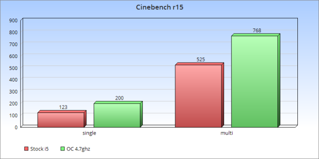 تحویل قدرت VRM توسط یک مدار فاز بسیار قدرتمند 12 فاز صورت می پذیرد.این مدار توسط یک هیت سینک و لوله های هیت،خنک می گردد.UEFI در دو مودینگ آسان و پیشرفته فعال است.مدل آسان شامل تنظیمات عمومی و Option هایی است که کاربران عمومی و آماتور با آنها سر و کار دارند.اما با انتخاب گزینه پیشرفته،اطلاعات دقیق و گرافیکی از تمامی توانایی ها در اختیار کاربر قرار خواهد گرفت.در قسمت پیشرفته می توان تمامی بخش های مهم را به صورت دقیق و دستی پیکر بندی کرد.از ولتاژ CPU تا اورکلاک حافظه رم و تنظیم LCC.در نهایت این مجموعه موفق به اورکلاک پردازنده i5-6400 در فرکانس موثر 4.7 گیگاهرتز (4704.56 Mhz) شده است.ولتاژ هسته در این فرکانس بر روی 1.376 است.اینک به سراغ نتایج بنچمارک ها خواهیم رفت.لازم به ذکر است که نتایج در حالت فرکانس استوک و OC نمایش داده شده است و می توان به خوبی تغییرات را احساس کرد.اولین بنچمارک Cinebench R15 است.