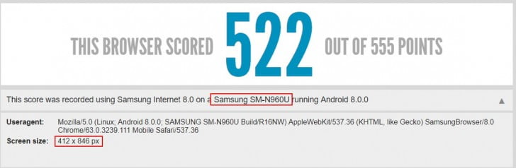 نتیجه تست HTML5 که احتمالاً به یک نمونه اولیه آن اختصاص دارد، مشخص کرده که این گلکسی نوت 9 هم دارای یک صفحه نمایش بی نهایت خواهد بود. رزولوشن این نمایشگر 412×846 اعلام شده که البته باید در نظر داشته باشید که بنچمارک ها همیشه بخشی از رزلوشن اصلی را ذکر می کنند، که از این اعداد می توان به نسبت ابعاد صفحه نمایش پی برد. آنچه که این رزولوشن نشان داده  است، نسبتی بزرگتر از 18:9 است که البته جای تعجب ندارد، چرا نمایشگرهای Infinity سامسونگ در پرچمداران اخیر نسبت 18.5:9 دارند.
