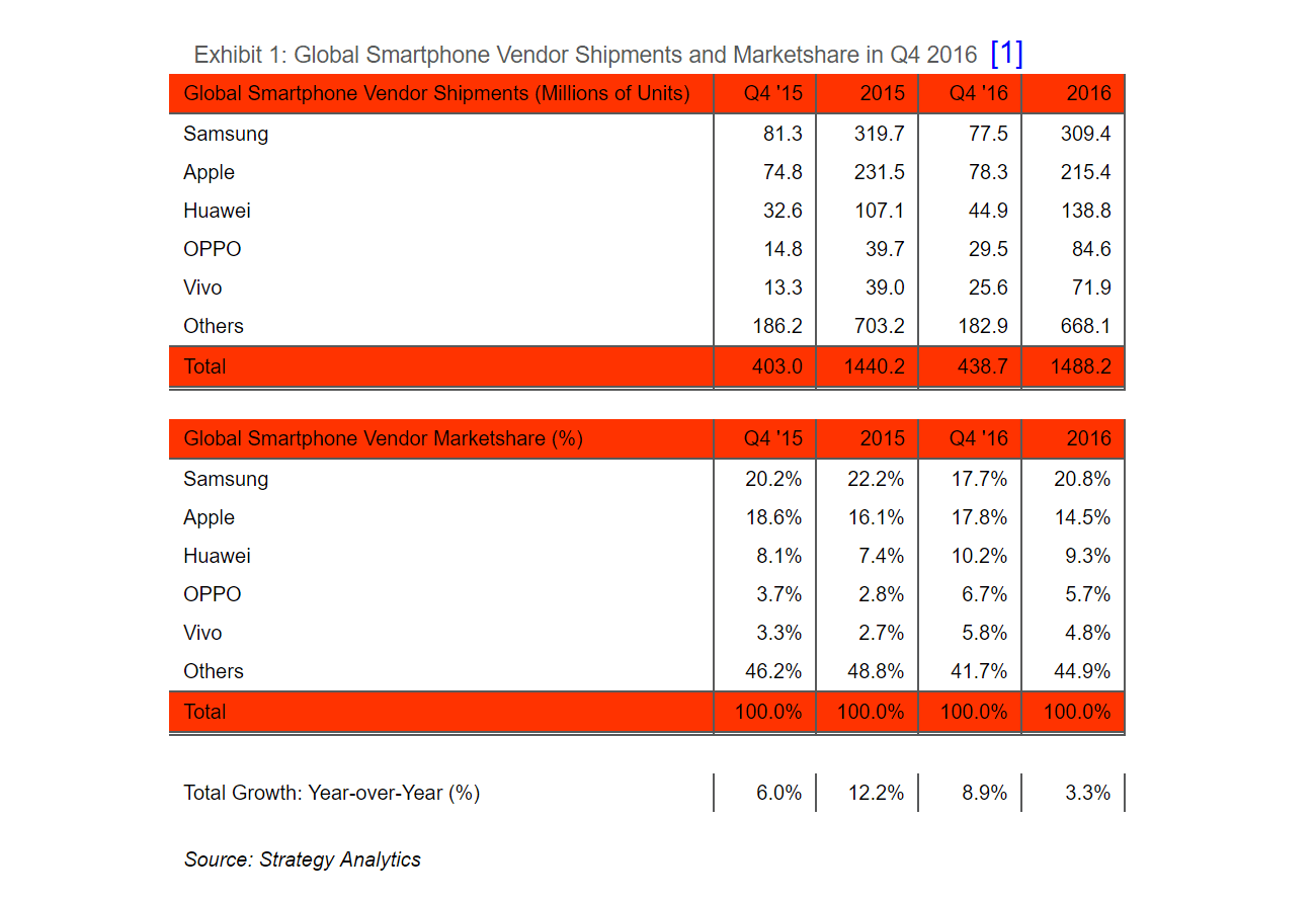 با این وجود در مجموع آمار در سال 2016 هنوز اپل در پشت سر رقیب کره ای خود قرار میگیرد و تا پایان سال 2016 نیز سامسونگ همچنان برترین سازنده ی گوشی های هوشمند در جهان بوده است. سهم کمپانی کره ای در سالی که گذشت نزدیک به 20.8 درصد بوده است و اپل با سهم 14.5 درصد نزدیک ترین رقیب سامسونگ است. در رده ی سوم نیز شاهد تغییری نیستیم و هواوی سومین سازنده ی برتر گوشی های هوشمند با سهم 14.5 درصد در سال 2016 بوده است. در این میان رشد سازندگان چینی چشمگیر بوده است و کمپانی اوپو با رشد 99 درصدی نسبت به سال قبل و کسب 5.7 درصد از سهم بازار به چهارمین تولید کننده ی برتر گوشی موبایل در جهان تبدیل شده است. کل رشد صنعت گوشی های هوشمند نیز نسبت به سال گذشته 3.3 درصد بوده است در حالی که این مقدار در سال 2015 نزدیک به 12.2 درصد بود.