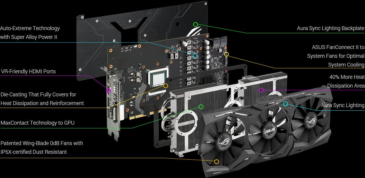 ایسوس که دو کارت گرافیک از سری STRIX را به مجموعه خود اضافه می کند، آنها را بر اساس تراشه های RX طرح ریزی کرده است. این شرکت به مواردی از جمله فناوری Aura Sync RGB LED، کولر ضخیم 2.5 اینچی، پوشش 40% بیشتر در محیط های برخورد، افزایش 30% در تهویه و سکوت تا 300% اشاره کرده است.