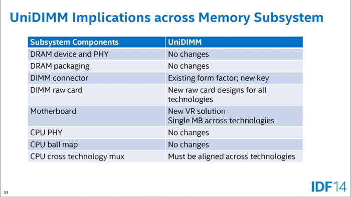 اما قبل از فراگیر شدن حافظه های DDR4، اینتل می خواهد از اتمام موجودی انبار شرکت های تولید کننده حافظه های DDR3 مطمئن شود. البته اینتل با ارائه پردازنده های جدید Core i7 روی پلتفرم Haswell-E به نحوی شروع استفاده از حافظه های DDR4 را زده اما همه کاربران توانایی پرداخت 400 تا 1000 دلار برای فقط پردازنده را ندارند. اینتل در این پلتفرم جدید از کنترلر IMC با پهنای باند 256 بیتی DDR4 با فرکانس 2133 مگاهرتز در استاندارد JEDEC استفاده کرده که به راحتی می تواند پردازنده های 6 یا 8 هسته ای را با پهنای باند 68 گیگابیت بر ثانیه تغذیه کند. حافظه های DDR4 راندمان انرژی خوبی را به ارمغان آورده اند به طوریکه ولتاژ کاری آنها در فرکانس 2133 مگاهرتز ، 1.2 ولت است. ولتاژ کاری حافظه های DDR3 ابتدا 1.8 ولت بود که با ورود پردازنده های Nehalem به 1.65 ولت کاهش یافت و درنهایت در پلتفرم Sandy-Bridge به 1.5 ولت رسید. خبرها حاکی از این موضوع است که اینتل می خواهد برای گذار از DDR3 به DDR4 از یک فرم حافظه جدید با نام UniDIMM استفاده کند. این فرم حافظه جدید یک DIMM با قابلیت پشتیبانی از هر دو نسل DDR3 و DDR4 است که برای استفاده در پردازنده های Skylake اینتل طراحی شده است. در واقع کنترلر IMC به کار رفته شده در پردازنده های Skylake، این امکان را برای پشتیبانی از هر دونسل حافظه ایجاد خواهد نمود. اسلات جدید برای UniDIMM دارای ابعاد استاندارد 69.9 x 20 میلی تر بوده و قرار است در دو مدل DDR3 UniDIMM و DDR4 UniDIMM هر دو با 260 پین و با یک برجستگی مشترک یکسان (اما متفاوت با DDR3 SO-DIMM فعلی) در مادربوردهای جدید تعبیه شود. ابتدا رم های DDR3/LPDDR3 UniDIMMs با فرکانس 1866 مگاهرتز و DDR4/LPDDR4 با فرکانس 2666 مگاهرتز و در مرحله بعد مدل های با فرکانس استاندارد بالاتر عرضه خواهند شد. (2133 مگاهرتز برای DDR3/LPDDR3 و 2933 مگاهرتز برای DDR4/LPDDR4)