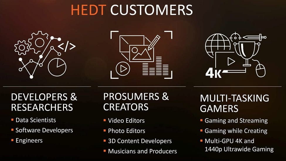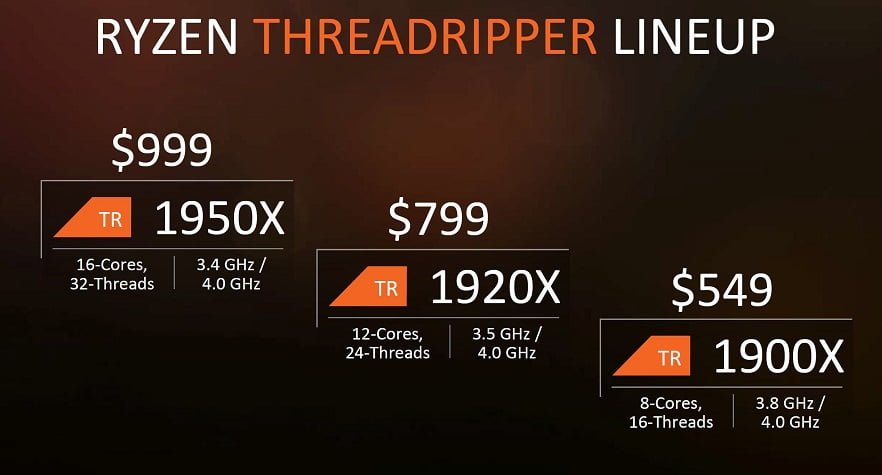 پردازنده ی 1950X با قیمت 999 دلار، 1920X با قیمت 799 دلار و در نهایت پردازنده ی 1900X با قیمت 549 دلار راهی بازار خواهند شد. پردازنده ی 1950X دارای 16 هسته و 32 رشته پردازشی بوده و فرکانس کاری 3.4~4.0 گیگاهرتز را ارائه می دهد. این محصول پرچمدار این گروه است. پردازنده ی 1920X نیز با 12 هسته و 24 رشته پردازشی و فرکانس کاری 3.5~4.0 گیگاهرتز معرفی شده است. در نهایت پردازنده ی 1900X نیز با در اختیار داشتن 8 هسته و 16 رشته پردازشی، به همراه فرکانس کاری 3.8~4.0 گیگاهرتز، آخرین محصول معرفی شده در این گروه است.