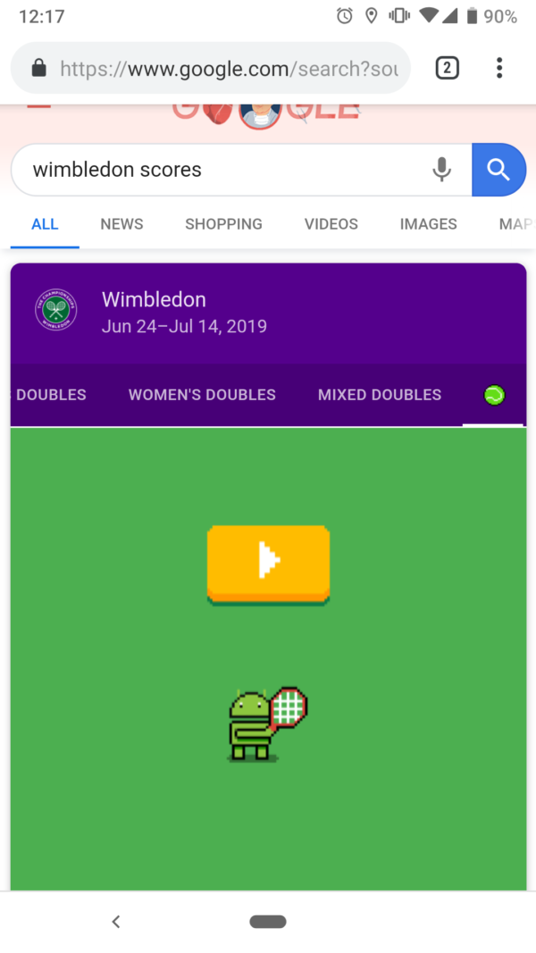 بزرگترین رویداد تنیس جهان، یعنی گرند اسلم ویمبلدون در شرف اتمام است. مسابقه فینال مردان امروز ساعت 17:30 بین راجر فدرر سوئیسی و نواک جوکویچ صربستانی آغاز خواهد شد و مسابقات زنان روز گذشته با شکست سرنا ویلیامز و قهرمانی سیمونا هالپ به پایان رسید. گوگل به مناسبت این رویداد بزرگ یک بازی مخفی در مرورگر کروم طراحی کرده است. این بازی بسیار ساده و دسترسی به آن آسان است.