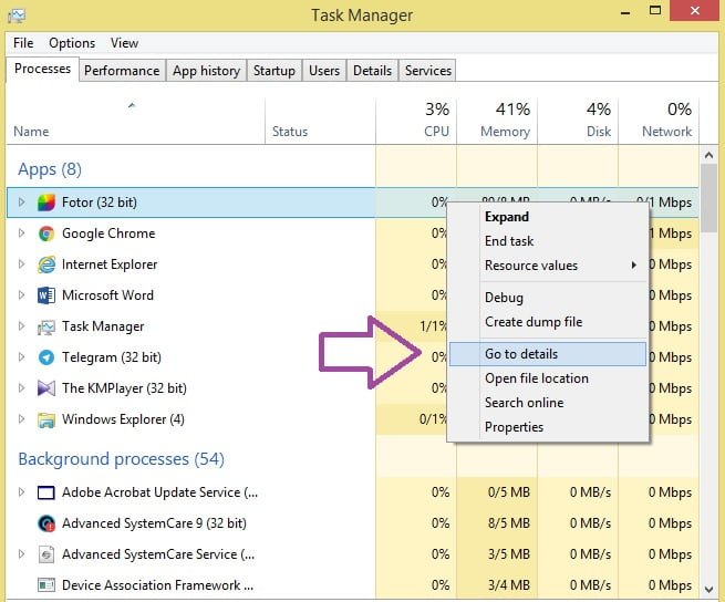 پس از رفتن به منوی Task Manager گزینه Details را انتخاب کرده و نام فایل اجرایی خود را جستجو می کنیم.برای آن که این جستجو مقداری آسان گردد،می توانید در قسمت Processes فایل و اجرا شده به شیوه آسان تری پیدا کرده،سپس روی آن کلیک راست کرده و گزینه Go To Details را انتخاب می کنیم.بدین ترتیب مستقیما به فایل اجرایی وارد می شویم.