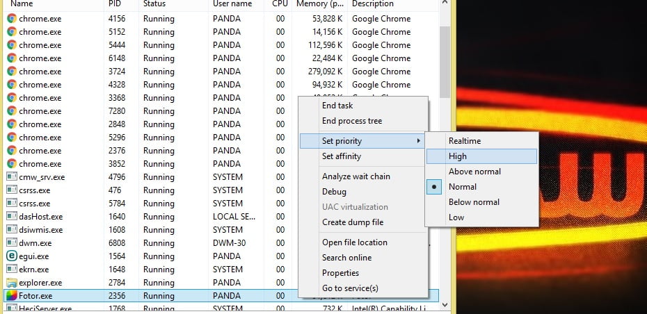 پس از آن مجددا بر روی فایل کلیک راست کرده و نشانگر موس را بر روی گزینه Set Priority میبریم.سپس 6 گزینه وجود دارد که با توجه به نام آنها،تشخیص معنی کار چندان سختی نیست.در صورت انتخاب گزینه ی High شما این دستور را به سیستم عامل می دهید که پردازش مورد نظر را در الویت قرار داده،و حداکثر توانایی سخت افزاری به آن تخصیص یابد.این راه حل گاها برای سیستم هایی که در مقدمه عرض شد،کارایی مناسبی را به اجرا می گذارد.