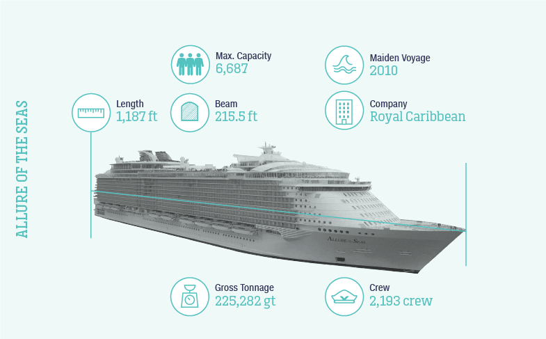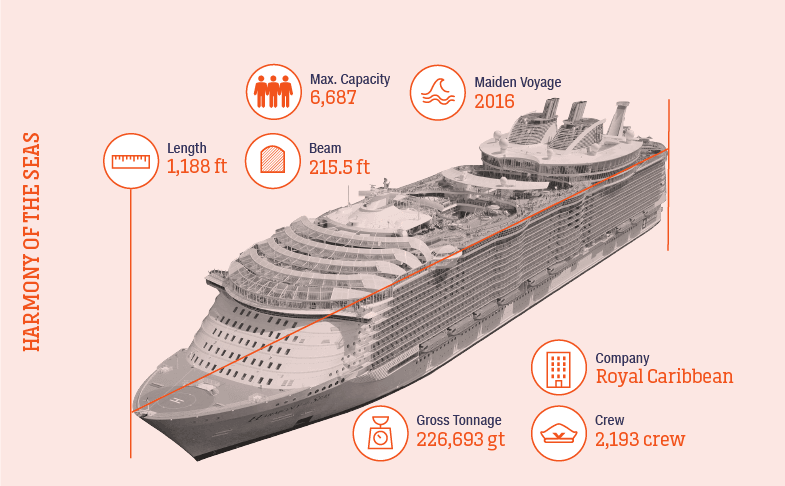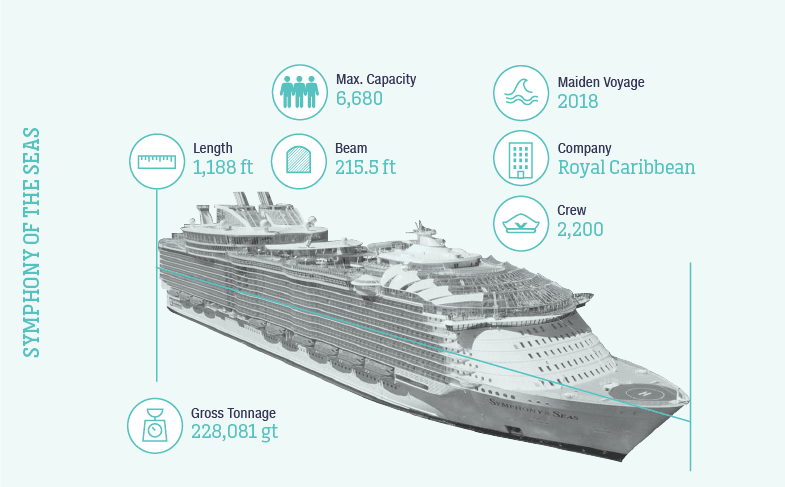 همانطور که از بزرگترین کشتی کروز در جهان انتظار میرود، همه چیز در سمفونی دریاها در مقیاسی بزرگ ساخته شده است. 18 عرشه که 16 تای آنها برای مهمانان است، 22 رستوران، 24 استخر، 2759 کابین و پارکی با بیش از 20 هزار گیاه گرمسیری و بلندترین سرسره آبی در دریا تنها بخشی از امکانات این کشتی است. سمفونی دریاها یکی از 4 کشتی Royal Caribbean’s Oasis class و جوانترین آنها به حساب می آید و با وجود آنکه می تواند پذیرای 6680 نفر باشد، شما هرگز حس نخواهید کرد که در یک مکان شلوغ قرار گرفته اید. تعداد خدمه این کشتی 2200 نفر می باشد.