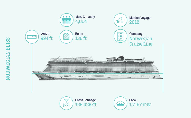 Norwegian Bliss جدیدترین و بزرگترین عضو نروژین کروز لاین است که در اواخر ماه اپریل امسال به دریا رفت. رستوران هایی که در لبه های کناری کشتی قرار گرفته است به مسافران اجازه میدهد تا ارتباط بیشتری با دریا حس کنند. این کشتی بزرگترین مسابقات کارتینگ و لیزر تگ در هوای آزاد را دارد.