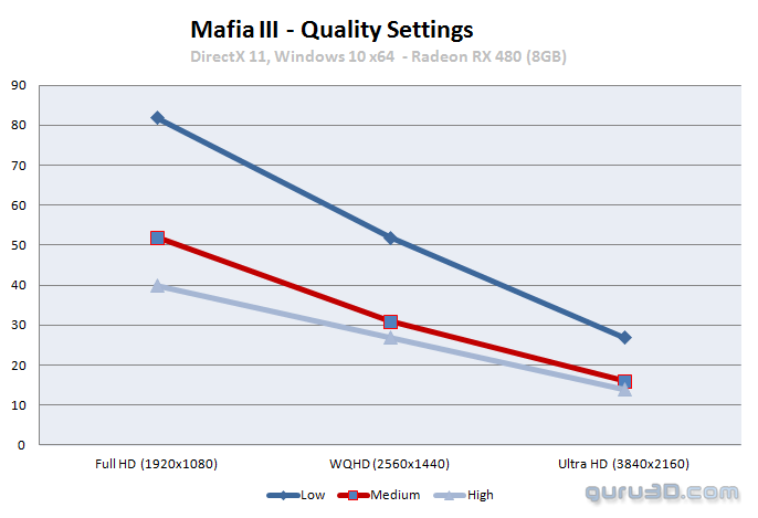 بازی Mafia III در واقع برای اجرا نیازمند یک سیستم بسیار قدرتمند و بروز می باشد و CPU پیشنهادی برای اجرا بازی Core i7-3770 3.0GHz or FX-8350 است و حداقل حافظه اجرایی مورد نیاز این بازی 8 گیگابایت و در کنار حداقل 2 گیگابایت کارت گرافیک GeForce GTX 960 یا AMD Radeon R9 280 می باشد. با استفاده از این سیستم کاربران قادر خواهند بود تا بازی را با کیفیت p1080p و نرخ 40 فریم بر ثانیه بر روی تنظیم گرافیکی متوسط اجرا نمایند اما اگر همانند ما از طرفداران بازی با کیفیت بالا بر روی کامپیوتر هستید در ادامه با ما همراه باشید. نتایج بدست آمده در تست ها با توجه به نسخه منتشر شده بازی در هفته گذشته می باشد و تمامی پچ ها با نرم افزار AMD Radeon ودرایورهای Nvidia بهینه سازی شده اند. در این مطلب نتایج بنچمارک ها با فریم ریت متوسط پوشش داده شده است و تمامی رزولوشن های معروف مانند Full HD (1920×1080/1200) ، WHQD (2560×1440) و UHDTV (2160p) با 3840 پیکسل عرض و 2160 پیکسل طول در نظر گرفته شده است.