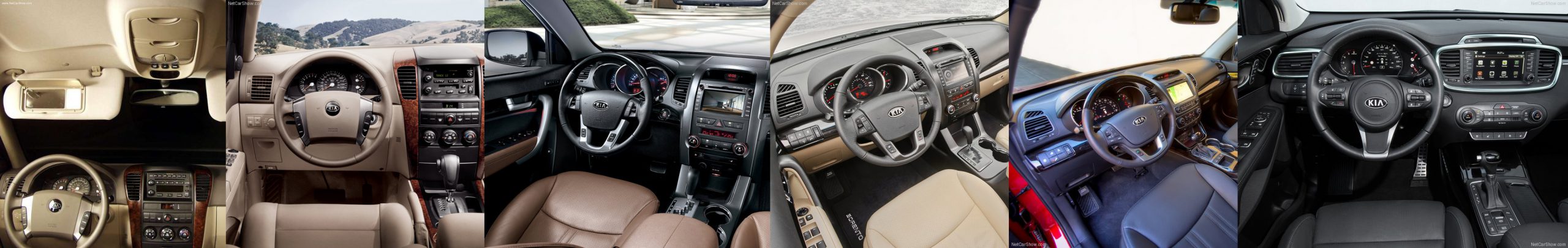همان طور که در تصویر می بینید کیا سورنتو در مدل های 2003، 2005، 2010، 2013، 2014 و 2016 (به ترتیب از چپ به راست) به نمایش در آمده است. بیشترین تغییر در چراغ ها، گریل جلو، سپر و چراغ های به کار رفته در آن مشاهده می شود و می بینید که تقریبا از سال 2010 و پس از 5 سال وقفه در تولید مدل سورنتو، کمپانی کیا به ارائه سبک نوین طراحی رو آورده است. از این زمان به بعد تغییرات ملایم تر شده و به تدریج به استانداردهای بین المللی نزدیک تر می شود تا اینکه در مدل 2016 خودرویی می بینیم که قابل رقابت با مدل های پر فروش دنیاست. همین داستان در طراحی داخلی ماشین نیز وجود دارد که در تصویر زیر مشاهده می کنید.