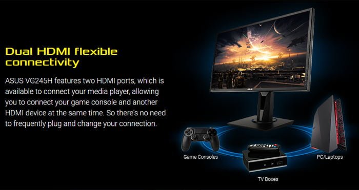 نسخه ی جدید از مانیتور VG245H در سایز 24 اینچ بوده و یک پنل TN با پشتیبانی از دقت FHD را به همراه دارد. دو درگاه HDMI در قسمت I/O ها به چشم می خورد و نرخ تجدید پذیری پنل نیز 75 هرتز است. زمان پاسخ به فرکانس در VG245H به 75 هرتز می رسد که البته انتظار بیشتری داشتیم! این مانیتور به تکنولوژی بهبود کیفیت فریم AMD تحت عنوان AMD FreeSync تجهیز شده است. یکی از فناوری های به کار رفته در این مانیتور GameFast Input Technology نام دارد. کاهش تاخیر در ورودی (Input Lag) کاربرد اصلی این فناوری است. GamePlus و GameVisual نیز به ترتیب با هدف کاهش سو سو زدن های عصبی کننده و کاهش نورهای آبی مزاحم طراحی شده است. 6 پروفایل مختلف بازی مانند RPG، RTS و FPS نیز برای آن تعریف شده است. یک آمپلی فایر 4 واتی به همراه دو اسپیکر استریو نیز در ساختار تکمیلی آن موجود است.