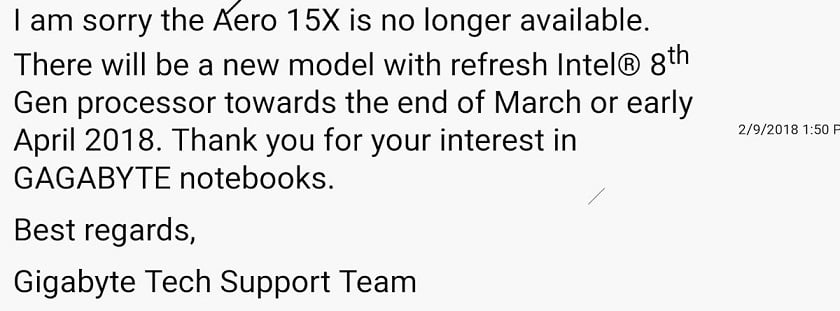 کمپانی گیگابایت به تازگی تولید لپ تاپ Aero 15X را متوقف کرده و این عمل به منظور جایگزینی آن با مدل هایی است که از پردازنده های جدید Intel Coffee Lake-H بهره می برند. نسل هشتمی های جدید به 6 هسته پردازشی مجهز گشته و High-End های گیگابایت و Intel Coffee Lake-H، تا دو ماه دیگر راهی بازارهای جهانی خواهند شد. پس اگر به خرید نوت بوک های مخصوص بازی فکر می کنید، برای عرضه پلتفرم جدید کمی دست نگه دارید.