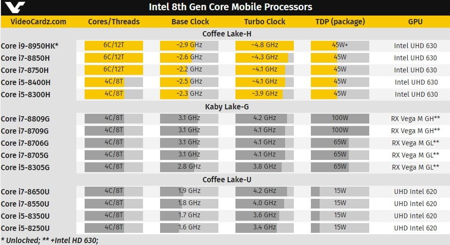 نخستین پردازنده ی Core i9 لپ تاپ تا فرکانس 4.8 گیگاهرتز (تک هسته) پیش خواهد رفت و توان حرارتی حداکثر 45 وات را حفظ خواهد کرد که همان اوج TDP در Kabylake-H ها بود. در حال حاضر پلتفرم Intel Coffee Lake-H با پردازنده های مشترک تولید شده توسط AMD و Intel وارد رقابت خواهد شد.