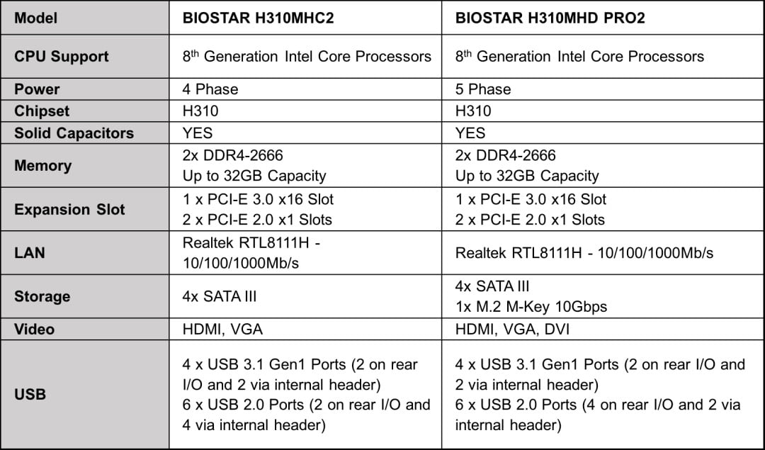این مادربرد به 4 رابط USB 3.1 Gen1 Type-A مجهز شده است. از جمله ویژگی های خاص این سری می توان به BIOSTAR Durable، سیستم های حفاظتی Moistureproof PCB, Super Anti-Surge Protection, Super LAN Surge Protection و پشتیبانی از ویندوز 7 در بایوس جدید اشاره کرد. مادربرد BIOSTAR H310MHC2 نیز در فرم micro-ATX، در بخش حافظه رم و SSD مانند H310MHD PRO2 عمل می کند. تقریبا تمامی ویژگی ها در این 2 مادربرد یکسان است.