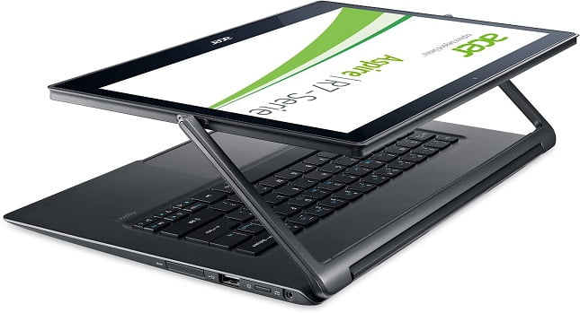 لپ‌تاپ مدل R7-371T برند ایسر است که طراحی متمایزی دارد و کمتر دستگاه هیبریدی را می‌توان شبیه به آن پیدا کرد. صفحه نمایش این لپ تاپ به بدنه پایینی متصل نیس و توسط دو لولا از اطراف محار می شود. به این ترتیب صفحه‌نمایش به کمک این دو پایه، قابلیت چرخش 360 درجه پیدا می‌کند و به دلخواه کاربر تنظیم می شود. حتی می‌توان از R7-371T مانند یک تبلت استفاده کرد. این نمایشگر دارای یک پنل IPS لمسی است و در سایز 13.3 اینچ از دقت FHD پشتیبانی می کند. HD Graphics 5500 پردازنده گرافیکی مجتمع آن است که در پردازنده Core i5 5200U جای گرفته است. این پردازنده فرکانس حداکثر 2.7 گیگاهرتز را به همراه 3 مگابایت حافظه Cache در اختیار شما قرار می دهد. همچنین 8 گیگابایت حافظه رم DDR3 در آن به کار رفته است و حافظه ذخیره سازی نیز یک SSD با ظرفیت 128 گیگابایت است. باتری 4 سلولی لیتیوم-یون با ظرفیت 3220 میلی آمپر ساعت نیز در زمان نبود برق تامین انرژی را بر عهده دارد. کیبورد این دستگاه از نوع جزیره‌ای و به نور پس‌زمینه مجهز بوده که برای تایپ‌های طولانی و سریع حتی در محیط‌های تاریک بسیار مناسب است. یک پورت HDMI، دو پورت USB 3.0، یک پورت USB 2.0 و یک کارت‌خوان در اطراف آن نصب شده است.