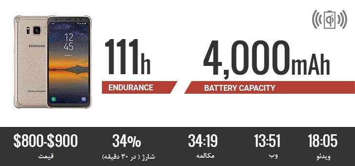 به لطف باتری 4000 میلی آمپر ساعتی، این گوشی 111 ساعت مقاومت می کند. در مقایسه با S8 معمولی (با 84 ساعت مقاومت) نسخه اکتیو عملکرد بهتری در تست باتری دارد. 4 ساعت زمان بیشتر برای وبگردی و تماشای ویدئو نشان از این موضوع دارد. این درحالیست که این گوشی تمام ویژگی های S8 مانند نمایشگر سوپر آمولد، دوربین دوگانه 12 مگاپیکسلی و اسنپدراگوم 835 را نیز دارد. اما متاسفانه این گوشی تنها در آمریکا به فروش میرسد.
