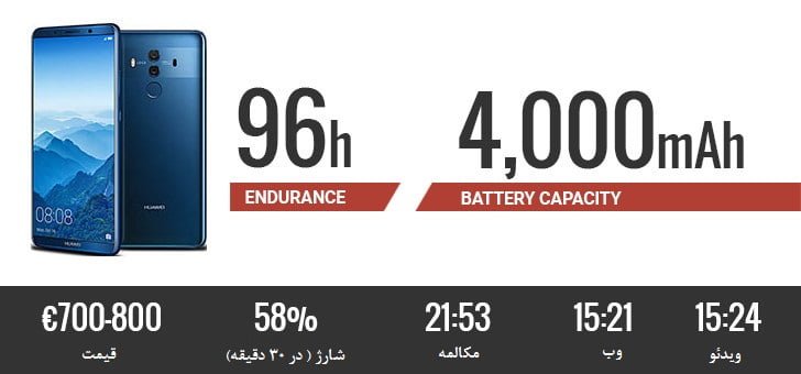 در مقایسه با پرچمداران سال 2017، باتری میت 10 پرو بهترین است و همین موضوع این گوشی را در بین 10 گوشی برتر قرار داده است. مقاومت 96 ساعته این گوشی در مقایسه با نوت 8 سامسونگ که 89 ساعت می باشد، نشان از عملکرد خوب این گوشی دارد. باتری 4000 میلی آمپر ساعتی این گوشی در مدت 30 دقیقه 58 درصد شارژ می شود. این در حالیست که نمایشگر 6 اینچی آمولد این گوشی از HDR10 پشتیبانی می کند.