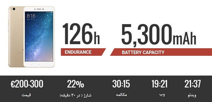 می مکس 2 با 126 ساعت مقاومت و قیمت 300 یورو به لطف باتری غول پیکر 5300 میلی آمپر ساعتی و چیپ ست کارآمد اسنپدراگون 625 رتبه اول لیست را به خود اختصاص داد. با قابلیت شارژ سریع مدت زمان کامل شدن باتری آن بسیار کوتاه است. می توان با این گوشی در حدود 22 ساعت فیلم تماشا کرد و 19 ساعت در اینترنت چرخید و همه اینها در یک گوشی 6.44 اینچی اتفاق میفتد.