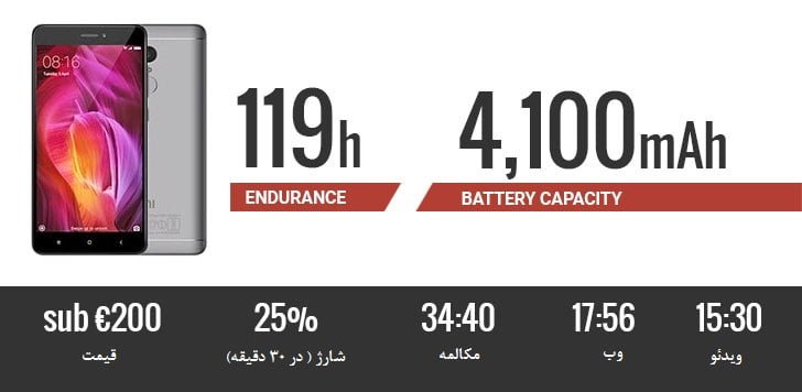 گوشی اقتصادی 5.5 اینچی ردمی نوت 4 که کمتر از 200 یورو قیمت دارد، با 119 ساعت استقامت رتبه دوم را به خود اختصاص داد. این گوشی هم بدلیل چیپ ست اسنپدراگون 625 عملکردی مشابه با می مکس 2 دارد اما با قیمتی در حدود 100 یورو کمتر از آن، از ارزش خرید بالاتری برخوردار است.