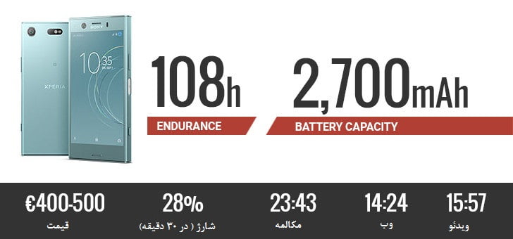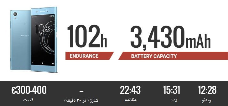 این گوشی با 100 ساعت پایداری باتری، نماینده میان رده های سونی در این لیست است. تماشای بیش از 15 ساعت ویدئو و 12 ساعت وبگردی نشانگر عملکرد خوب این گوشی می باشد.