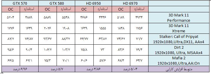 در HD 6970 حداکثر فرکانس موجود برای پردازندهگرافیکی 950 مگاهرتز و حافظه 5800 مگاهرتز مؤثر است. اما این مقدار در HD 6950 بسیار محدود شده و برای پردازندهگرافیکی و حافظه به ترتیب به 840 و 5300 مگاهرتز ميرسد. بد نیست، برای دفع بهتر گرما کنترل سرعت فن را از حالت خودکار خارج کرده و به صورت دستی بالا ببرید. در HD 6950 تمامی تستها با حداکثر فرکانس ممکن حافظه و پردازندهگرافیکی انجام شد اما در HD 6970 مقدار فرکانس پردازندهگرافیکی در نرمافزارهای Dirt 2 ،Stalker:Call of Pripyat ،3D Mark 11 وMafia 2 به ترتیب 940، 950، 920 و 930 مگاهرتز بود. مقدار فرکانس حافظه نیز روی 1450 قرار داشت.