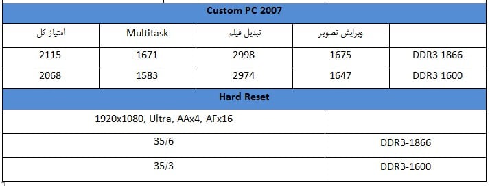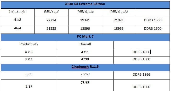 کارایی حافظه در سطح خوبی قرار دارد و در سیستم تست ما، حافظه DDR3 1866 اندکی از مدل DDR3 1600 قوی‌تر است (در پلتفرم سندی‌بریج اختلاف این دو فرکانس حافظه چندان زیاد نیست). با این حال، برای اورکلاک این حافظه ناکام ماندیم و به حداکثر فرکانس ذکرشده روی حافظه اکتفا کردیم. در جدول 1، نتایج تست این دو حافظه را مشاهده می‌کنید.