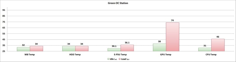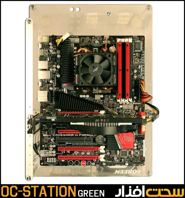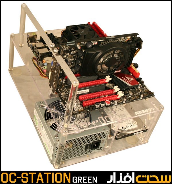 سیستمهای اسکلتباز (Open Frame) همیشه خواسته یک اورکلاکر بوده و آنها ترجیح میدهند، سیستم خود را روی آن سوار کنند. OC Station شرکت گرین از جنس Acrylic است و ضخامتی معادل 5/7 میلیمتر دارد. اسکلت آن در مقایسه با اسکلتبازهای شرکتهای بزرگی مانند Lian-Li در سطح پایینتری قرار دارد اما این نکته، آخرین معیار برای یک اورکلاکر است. از مزایای آن میتوان به عدم محدودیت در ابعاد کارتگرافیک و سهولت در دسترسی به قطعات اشاره کرد. از معایب این کیس نیز بايد به عدم وجود جایگاهی برای هاردديسکها یا SSDهای 2/5 اینچی اشاره کرد. افزایش میزان گردوغبار قطعات را نیز بايد به موارد بالا اضافه کرد که البته فلسفه وجودی تمامی سیستمهای اسکلتباز همواره با مسئله گردوغبار گره خوردهاست. در انتهای مقاله، میتوانید تفاوت دمایی قطعات در یک سیستم اسکلتباز (Open Frame) را با یک کیس همرده و همقیمت مقایسه کنید.