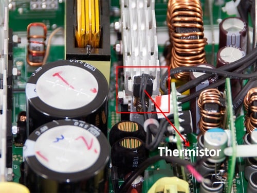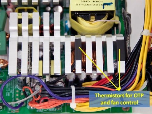 منبعتغذيههايي كه داراي اين نوع محافظت هستند در حرارتگير (Heatsink) ثانويه داراي ترميستور هستند. ترميستور در حقيقت مدار محافظت را در مورد درجه حرارت حرارتگير مطلع ميكند. اگر درجه حرارت بيش از مقدار پيشفرض شود منبعتغذيه خاموش خواهد شد.
