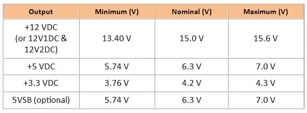 همانطور كه اشاره شد UVP و OVP ولتاژ هريك از خطهاي منبعتغذيه را بررسي ميكند و در صورتيكه مقادير آنها از مقدار مجاز بيشتر يا كمتر باشند واكنش نشان ميدهند. استاندارد ATX 2.31 مقادير حداكثر، حداقل و استاندارد ولتاژهاي مختلف مشخص كرده است. در جدولي كه در ادامه آمده اين مقادير براي UVP مشخص شده است. لازم بذكر است كه محافظت از ولتاژ 5VSB جزو مشخصههاي ضروري استاندارد ATX نيست.