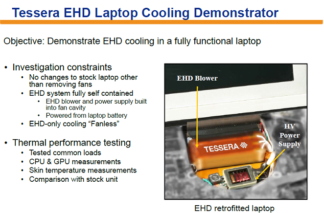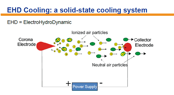 تکنولوژی Fanless به این صورت کار میکند که،تکنیک پمپ بادی یونی الکتروهیدرو دینامیک (EHD) که به تازگی برای خنک کردن لپ تاپ ها ترتیب داده شده شامل اعمال یک فشار الکتریکی به الکترودی است که می تواند یک میدان الکتریکی با شدت بالا تولید کند. در این سیستم ملکول های هوا ذرات الکترود یونیزه شده را  احاطه کرده اند و زمانی که این ملکول ها  از الکترود ” کرونا” به الکترود”  کلکتور ” حرکت می کنند با ملکول های خنثی در هوا برخورد کرده و شدت برخورد آنها ملکولهای خنثی را به طرف مناطق گرم هل داده و آنجا را خنک می کند.