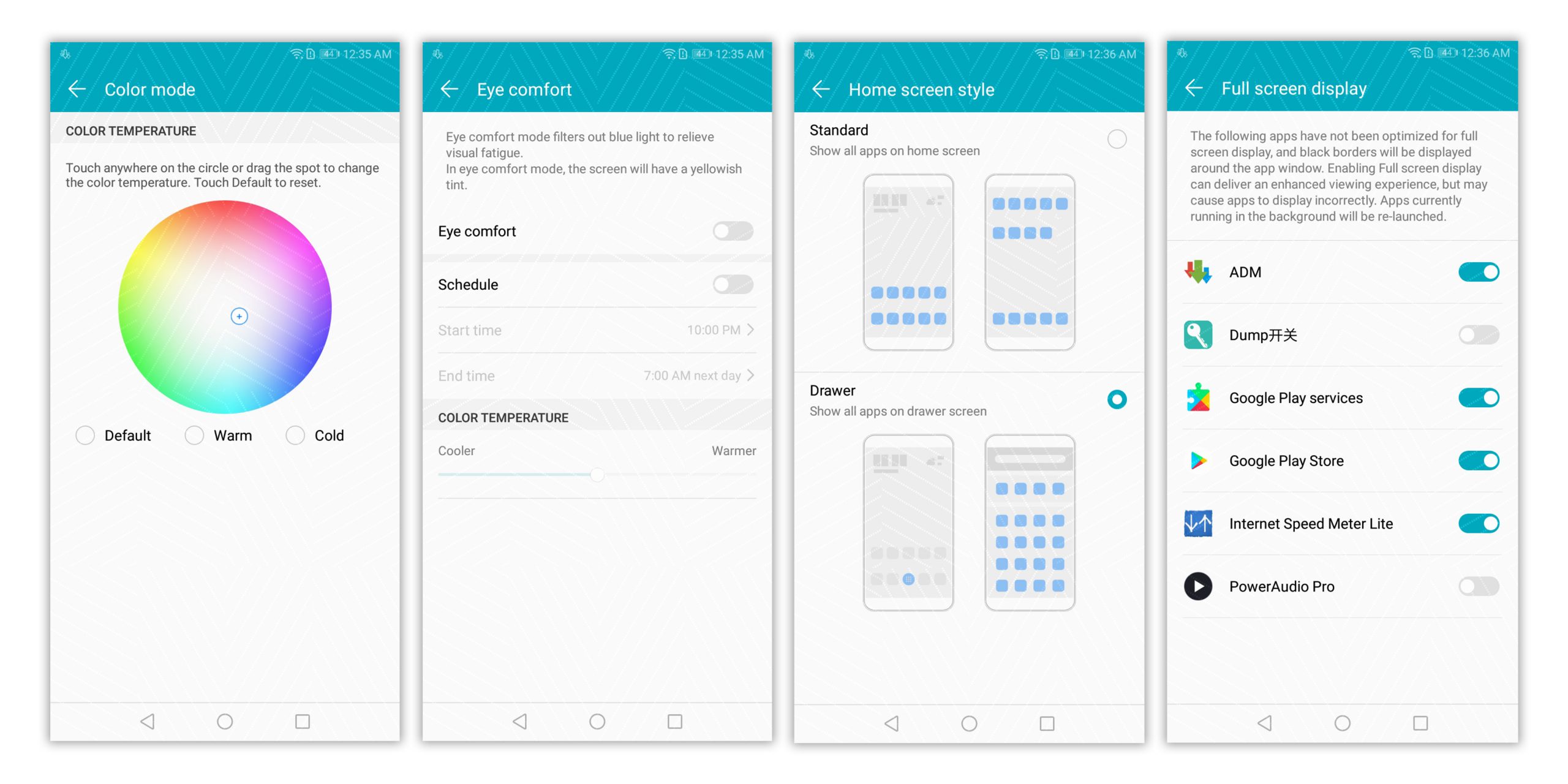 منوی Display گوشی آنر 7C تنظیمات نسبتاً کاملی از صفحه نمایش ارائه میدهد. در این منو پس از گزینه تنظیم روشنایی (Brightness)، گزینه Color Mode وجود دارد که در آن شما می توانید نوع رنگ صفحه نمایش را به حالت گرم، سرد و یا رنگ دلخواه خود درآوردید. گزینه Eye Comfort که پیش از این تنها در گوشی های بالارده دیده میشد، در آنر 7C به شما اجازه میدهد با خاموش کردن پیکسل های آبی آسیب کمتری به چشمانتان وارد کنید، البته امکان کم و زیاد کردن شدت نور زرد نیز در این تنظیمات وجود دارد. در بخش Home Screen Style می توان انتخاب کرد که گوشی به حالت استاندارد EMUI باشد و یا مجهز به منوی Drawer که همه برنامه های نصب شده روی گوشی را نمایش میدهد. در بخش Full Screen Display هم می توان انتخاب کرد که کدام برنامه ها به حالت تمام صفحه در گوشی به نمایش درآیند و کدام برنامه ها طبق اندازه استاندار تعیین شده خودشان.