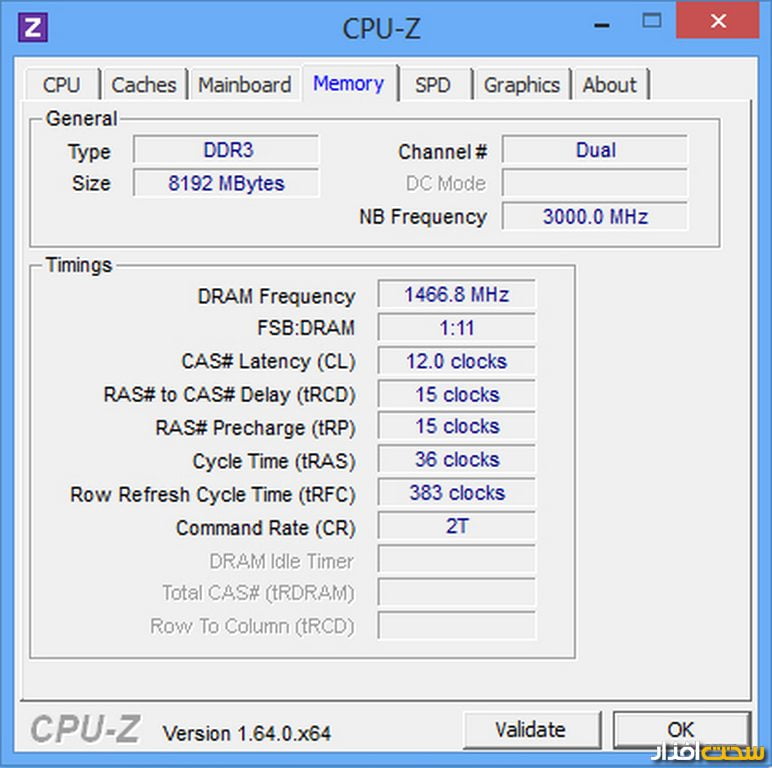 که هماهنگ با مادربوردهای حرفه ای و سری اورکلاک سازندگان مختلف مادربورد است (خود ماژول حافظه نیز عبارت Overclocking Memory Module را یدک میکشد). با نگاهی به محل اتصال خنک کننده به بدنه RAM، خواهید دید که چیپست های حافظه تنها در یک سمت از ماژول قرار گرفته اند. روی هر ماژول حافظه هشت چیپست حافظه قرار گرفته که در کل چهار گیگابایت حافظه را روی هر ماژول تشکیل میدهند.مدلی که بهدست ما رسیده از حداکثر فرکانس کاری DDR3-2933 پشتیبانی میکند و قطعاً برای دسترسی به این فرکانس باید به سراغ پلتفرم Z87 اینتل برویم. به همین خاطر ما نیز از مادربورد Gigabyte Z87X-D3H، پردازنده Intel Core i5-4670K، کارت گرافیک PowerColor R9 270X، درایوهای ADATA SX900 128GB و Apacer Turbo II 120GB و منبع تغذیه Green GP1235B رفتیم. خوشبختانه بدون نیاز به به روزرسانی بایوس و تنها با انتخاب پروفایل XMP، فرکانس 2933 مگاهرتز شناسایی شده و تنظیمات مورد نیاز آن اعمال شدند. با مراجعه به نرم افزار CPU-Z مشاهده میشود که زمان تاخیر 12-15-15-36 برای آن تنظیم شده است (تصویر 2).