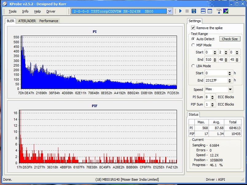 براي تست کيفيت ضبط هم براساس استانداردهاي موجود از نرمافزار KProbe ODD Tester نسخه 2/5/2 استفاده کرديم. ديسک ضبطشده با درايو بوفالو را در داريونوري SH-S223F شرکت سامسونگ تست کرديم. اين درايونوري توانست در ديسكنوري نوع DVD-R به ترتيب مقدار متوسط 87 و 1/34 را در حالت PI (اشکالات قابل تصحیح) و PIF (اشکالات جدی) به دست آورد كه اين مقدار در ديسكنوري DVD+R به ترتيب 92 و 3/25 بود (محدوده استاندارد PI و PIF به ترتيب 280 و 32 است).
