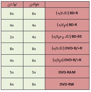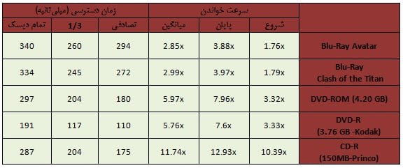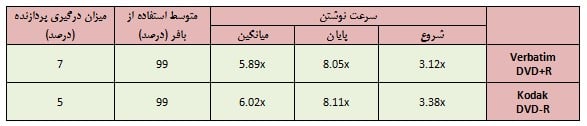 نکته جالب در اين ميان، کسب نتايج نزديک به هم در حالت Burst Speed بود. چون تقريباً در پنج ديسکنوري تستشده، سرعت Burst Speed حدود 22 تا 24 مگابايت در ثانيه بود که براي يک داريونوري خارجي، سرعت انتقال اطلاعات مناسبي است. در تست سرعت رايت درايو، به دليل نداشتن ديسکنوري Blu-Ray به ناچار اين داريو را با ديسکهاي نوري DVD-R شرکت Kodak و DVD+R شرکت Vebatim تست کرديم که نتايج آن در جدول 3 مشاهده ميکنيد.