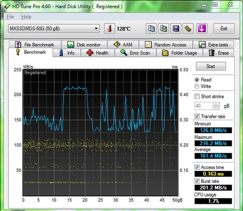 در تست PC Mark Vantage، امتیاز کل 14622 به دست آمد که در بخش هاردديسک امتیاز کسبشده توسط اين درايو، 26198 بود. براساس نتایج به دست آمده از نرمافزار HD Tune Pro 4.6، حداکثر سرعت خواندن اطلاعات تقریباً مشابه آن چیزی است که روی درایو نوشته شدهاست. در اين تست، متوسط زمان دسترسی حدود 0/163 میلیثانیه بود که زمان مناسبي است (تصویر 1).
