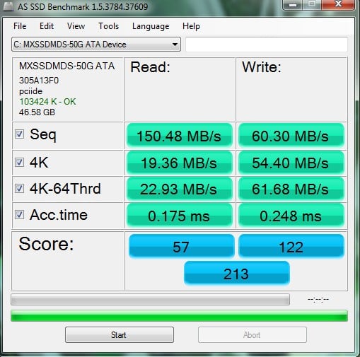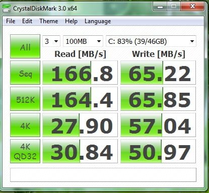همچنین در تصاویر 2 و 3، نتایج تست نرمافزارهای Crystal Disk Mark و AS SSD نشان داده شدهاست که مقدار متوسط این نتایج در تست Sequential حدود 165 مگابایت در ثانیه (در زمان خواندن) است.