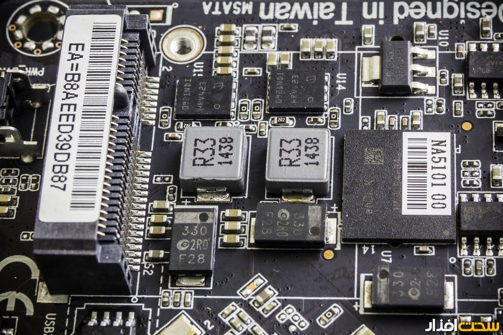 چهار گیگابایت حافظه DDR3L: ECS از چهار ماژول حافظه SKHynix (هر یک با ظرفیت یک گیگابایت) در دو سمت برد دستگاه ساتفاده کرده است. این میزان حافظه بین پردازنده گرافیکی مجتمع و پردازنده اصلی به شکل مشترک استفاده میشود. توصیه میکنیم تا حد امکان حتما نسخه چهار گیگابایتی را خریداری کنید. باتری CMOS نیز در این تصویر به خوبی مشخص. این باتری با دو رشته سیم به برد متصل است.