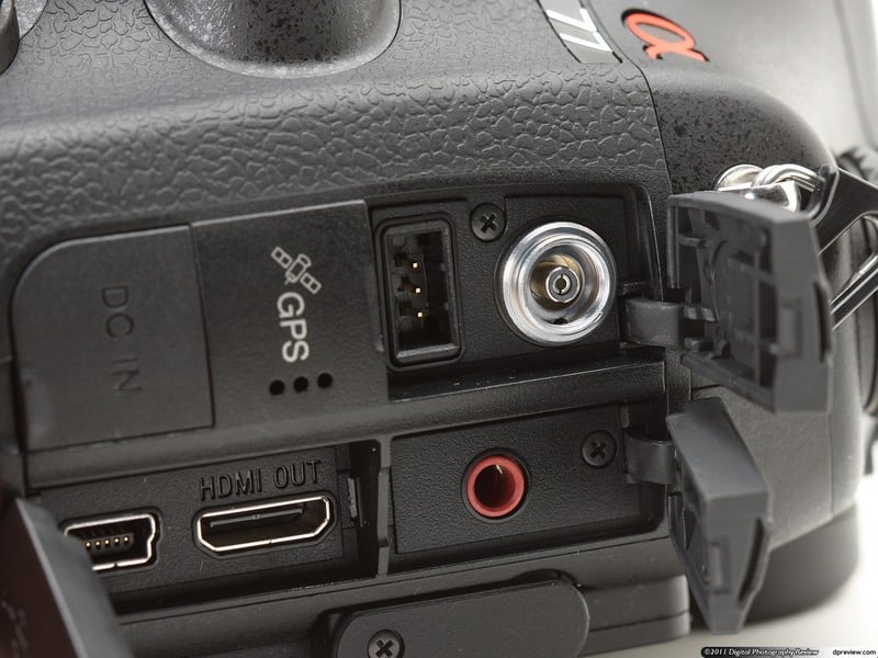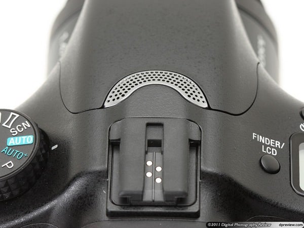 در بالای دوربین a77 هم پایه فلاش و هم میکروفون استریو برای ضبط ویدئوی وجود دارد. اگرچه میکروفون دوربین دارای قابلیت کاهش یا افزایش صدا نیست، اما حداقل به قابلیت کاهش نویز وزش باد مجهز است تا حداقل صدای وزش باد در ویدئو‌ها شنیده شود. (تصوير سه)