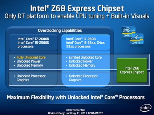 همانطور كه گفته شد، يكي از ويژگيهاي برجسته چيپست Z68 اينتل اين است كه كاربر علاوه بر اينكه ميتواند از پردازندهگرافيكي مجتمع درون پردازنده استفاده كند، قادر است به اوركلاك پردازنده نيز بپردازد. البته به اين نكته بايد توجه كرد كه پردازندههاي Sandy Bridge كه قابليت Turbo در آنها وجود ندارد، با اين چيپست و حتي P67 قابل اوركلاك نيستند. بهطور كلي، تمامي پردازندههاي سري Core i3 2xxx مانند Core i3 2100 قابليت اوركلاك ندارند .