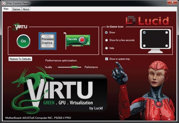 اگر قصد استفاده از كارتگرافيكي و پردازندهگرافيكي مجتمع درون پردازنده را داشتهباشيد، ميتوانيد به دو روش Virtu پيكربندي كنيد. روش اول، اتصال صفحهنمايش به خروجي گرافيكي پردازنده (وضعيت i-mode) و روش دوم، اتصال صفحهنمايش به خروجي كارتگرافيكي (وضعيت d-mode) است. در وضعيت اول، پردازندهگرافيكي مجتمع در پردازنده، تمامي وظايف مربوط به پردازش تصوير صفحهنمايش را برعهده ميگيرد. حال برخي از برنامههاي كاربردي براي اجرا نيازمند پردازندهگرافيكي مستقل هستند. در چنين مواقعي، پردازندهگرافيكي مستقل وظيفه پردازش دادهها را برعهده ميگيرد اما از آنجا كه پردازندهگرافيكي درون پردازنده مستقل از صفحهنمايش است، دادهها بايد به حافظه پردازندهگرافيكي پردازنده منتقل شوند. در اين وضعيت، كارايي اندكي افت پيدا ميكند، بهطوري كه در بيشتر مواقع، شاهد افت كارايي حدود ده درصد هستيم اما برخي مواقع نيز تفاوت كارايي چهل درصدي را نيز شاهديم. در اين وضعيت، هنگامي كه از كارتگرافيكي استفاده نميشود، كارتگرافيكي در حالت بيكاري و پايينترين وضعيت مصرف انرژي قرار ميگيرد، اگرچه بهطور كامل خاموش نميشود .