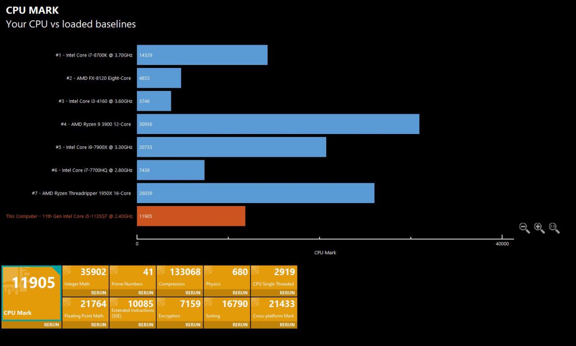 نتایج بنچمارک در بررسی لپ تاپ میت بوک D 15 2021 هواوی حکایت از امتیازهای فوق العاده بالا و بهترین در کلاس خود ندارد. امتیازات کسب شده در بنچمارک‌های گیک‌بنچ، Cinebench، Passmark و … همان چیزی را نشان می‌دهد که از یک لپ‌تاپ میان‌رده با چنین سخت‌افزاری انتظار می‌رفت. با این حال، در تست‌هایی مانند Cinebench عملکرد این لپ‌تاپ در بخش تک هسته بهتر از رقبای هم سطح خود است. نکته مهم دیگر در خصوص بنچمارک‌های این لپ‌تاپ این بود که تقریباً در تمامی تست‌های انجام شده، امتیاز این لپ‌تاپ به شکل محسوسی بالاتر از نسخه سال قبل خود بود که این نشان از پیشرفت سخت‌افزاری دستگاه دارد.