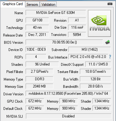نکته جالب دیگر، وجود کارت‌گرافیک مدل NVIDIA Geforce GT 630M در این نوت‌بوک است و می‌توان گفت این یکی از نوت‌بوک‌هایی است که در این رده از یک کارت‌گرافیک سری 600 استفاده کرده است. این نوت‌بوک جزو محصولات مخصوص بازی به شمار نمی‌آید، اما همین سخت‌افزار متعادل در اجرای بازی‌هایی که روی آن تست کردیم، به نسبت خوب عمل کرد و کارایی خوبی از خود به نمایش گذاشت (البته در صورت غیرفعال ساختن برخی گزینه‌های گرافیکی و گاهی اوقات کم کردن دقت تصویر). فرکانس این کارت‌گرافیک 672 مگاهرتز و فرکانس موثر حافظه آن 1800 مگاهرتز است که در کنار رابط حافظه 128 بیتی، پهنای باند 28/8 گیگابایت در ثانیه را ایجاد می‌کند.