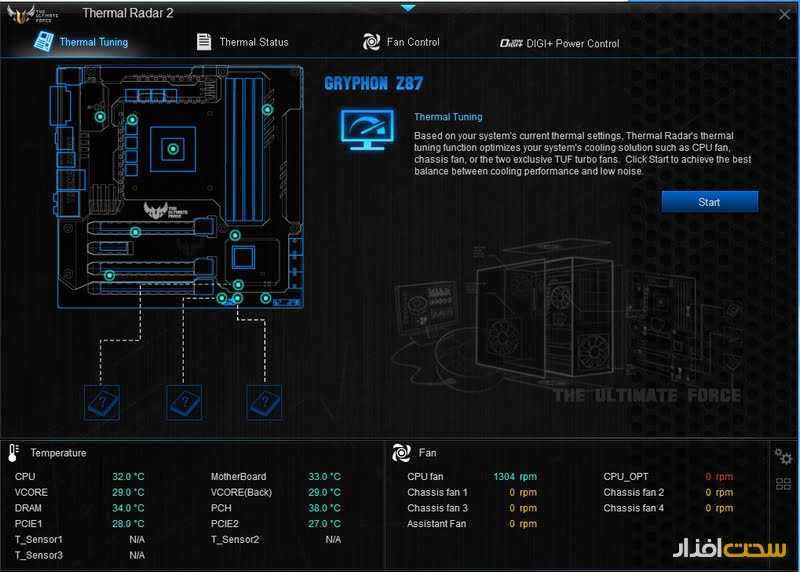 با آنکه در این مادربورد از چیپست Z87 استفاده شده است، اما در عین حال برخی امکانات را در اختیار نداریم که عدم وجود آنها و اینکه این مسئله خوب است یا بد، به نحوه استفاده شما از این مادربورد و طرحی که در سر دارید بستگی خواهد داشت. اولین محدودیت در پشتیبانی از حافظه است که در مقایسه با یک مادربورد Z87 حرفهای (که عموماً حافظههایی با فرکانس بسیار بالا را نیز پشتیبانی میکنند) در سطح پایینتری قرار میگیرد. این مادربورد توانایی شناسایی حافظههای Apacer Ares DDR3-2933 و Apacer Ares DDR3-2666 را نداشت، اما در نهایت توانست به خوبی با حافظههای Apacer Ares DDR3-2400 کار کند. نکته جالب اینجاست که مادربورد میتواند فرکانس این حافظه را به سادگی به 2666 مگاهرتز رسانده و تمامی تستها را با این فرکانس پشت سر بگذارد (اما نکته جالبتر این است ایسوس در سایت و دفترچه مادربورد پشتیبانی از حداکثر فرکانس 1866 مگاهرتز را ذکر کرده است). تنوع پورتهای روی مادربورد نیز میتوانست بهتر باشد و مجموعه متنوعتری را به کاربر ارائه دهد. دکمههای روشن و خاموش و ریست و Debug LED از روی مادربورد حذف شده اند که با توجه به ابعاد مادربورد چندان جای ایراد گرفتن باقی نمیگذارد. اما دکمههای ورود مستقیم به بایوس، BIOS Flashback و Mem OK! (برای تنظیم خودکار فرکانس حافظه) همچنان وجود دارند. با این حال در حالت کلی امکانات خوبی در این مادربورد در نظر گرفته شده است. پشتیبانی از دو کارتگرافیک همچنان وجود دارد و شش پورت USB 3.0 در کنار خروجیهای تصویری DVI و HDMI در اختیارتان قرار میگیرد. همچنین هفت سنسور برای بخشهای مختلف مادربورد در نظر گرفته شده و خود کاربر نیز میتواند سه سنسور به مادربورد متصل کنید. همچنین این امکان را دارید تا با استفاده از نرمافزار AI Suite 3، یک پروفایل اختصاصی برای سیستم خنککننده کیس بسازید و به بهترین نتیجه در خنککنندگی سیستم برسید (تصویر 2).