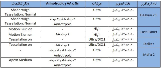 به اين دلیل که پیکربندی Crossfire بارها توضیح داده شده و گفتن آن تکرار مکررات است، به سراغ نرم‌افزار‌ها و نتایج تست‌ها می‌رویم تا زودتر به موارد دلخواه خود برسید. برای تست کارت‌گرافیک HD 6990 از پنج تست معروف که مورد تأیید سایت‌های مختلف است، استفاده کردیم که این نرم‌افزار و تنظیمات انجام‌شده برای تست، در جدول زير درج شده‌است (البته به دليل وجود مشکلات موجود در تست Dirt 3 از این تست صرفه‌نظر کردیم).