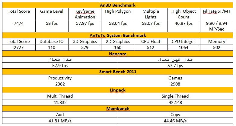 جدول زیر نتایج تست این گوشی در تست‌ها و شرایط مختلف را نشان می‌دهد: